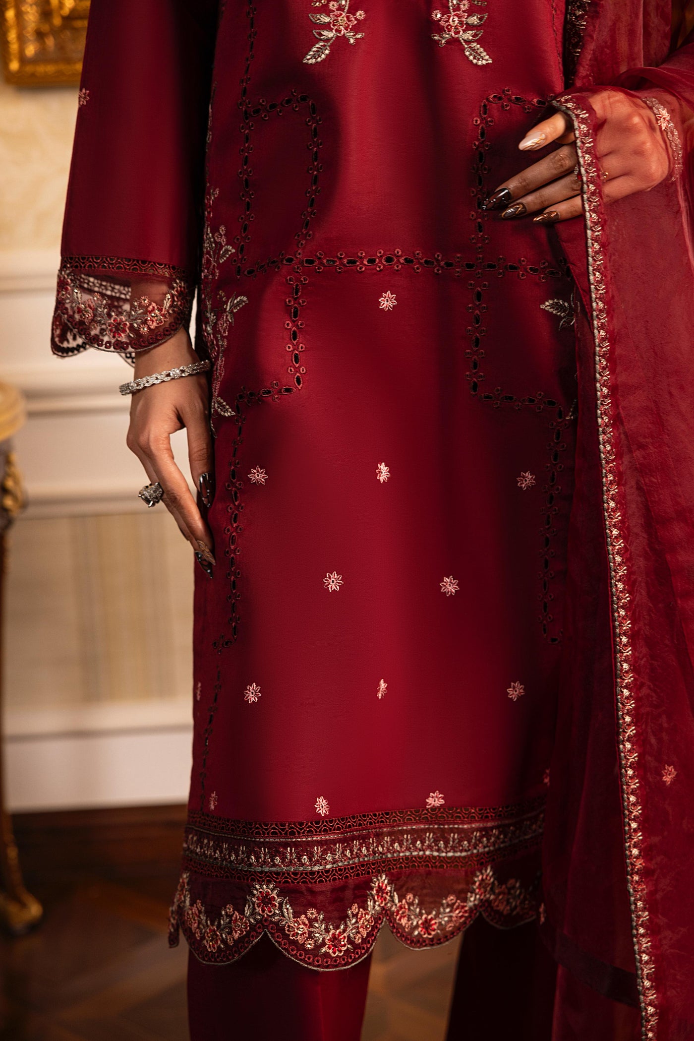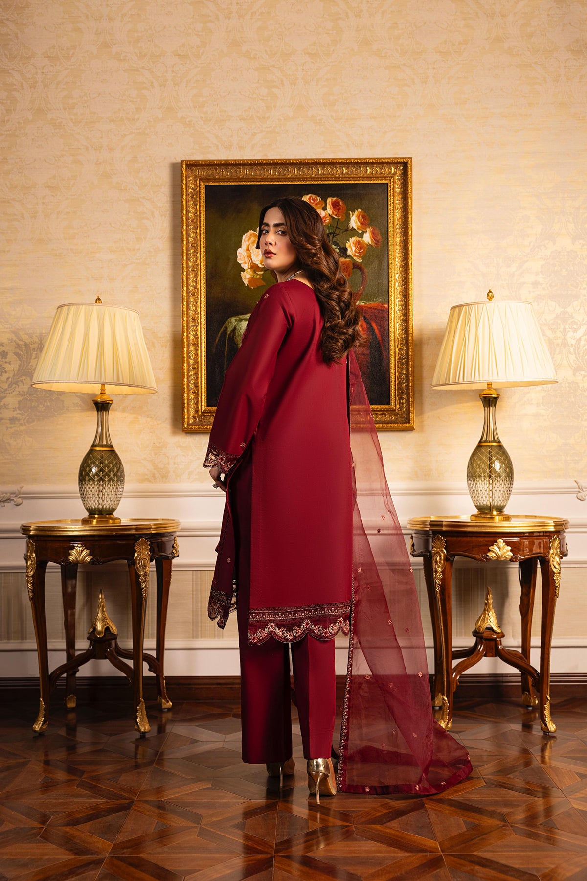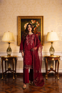 Embrace the essence of royalty with Elairah, a luxurious three-piece lawn ensemble in a rich crimson hue. Adorned with intricate embroidery that gracefully decorates the neckline, sleeves, and borders, this design exudes timeless elegance and grandeur. The embroidered dupatta, crafted with sheer finesse, adds an ethereal touch to the overall look.