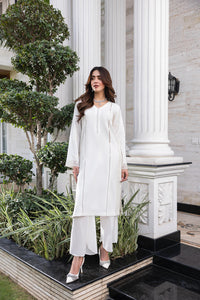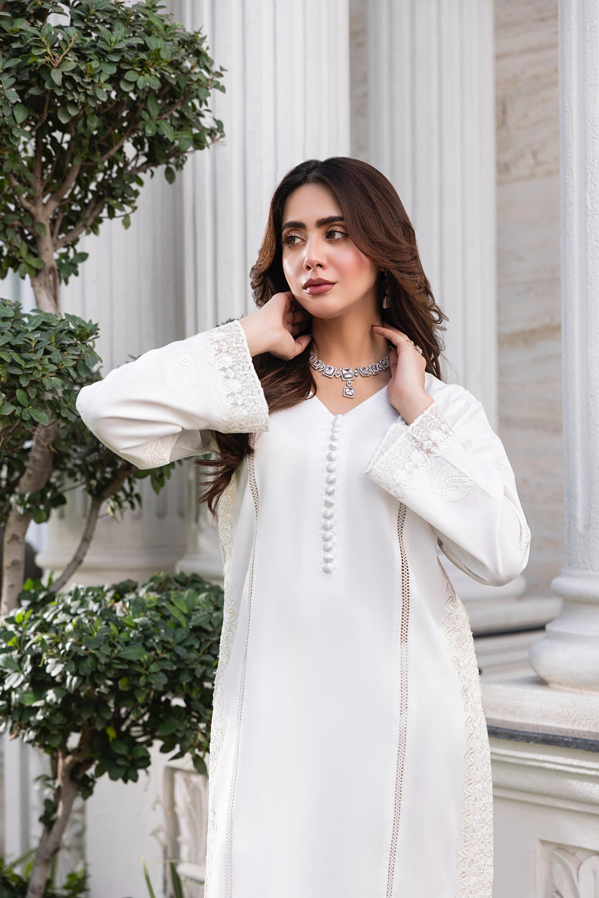 Grace meets sophistication in Ivora, a timeless white lawn outfit designed for understated luxury. Crafted from premium lightweight lawn, this ensemble features delicate lace detailing along the sleeves and side panels, a sleek V-neckline adorned with fabric buttons, and gracefully tailored wide-leg pants. Perfect for daytime gatherings or festive soirées, Ivora blends classic charm with modern minimalism for an effortlessly chic look.