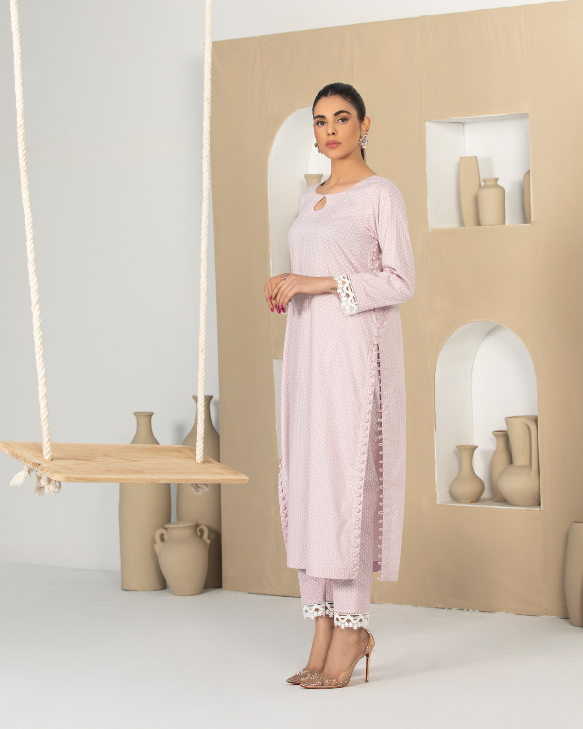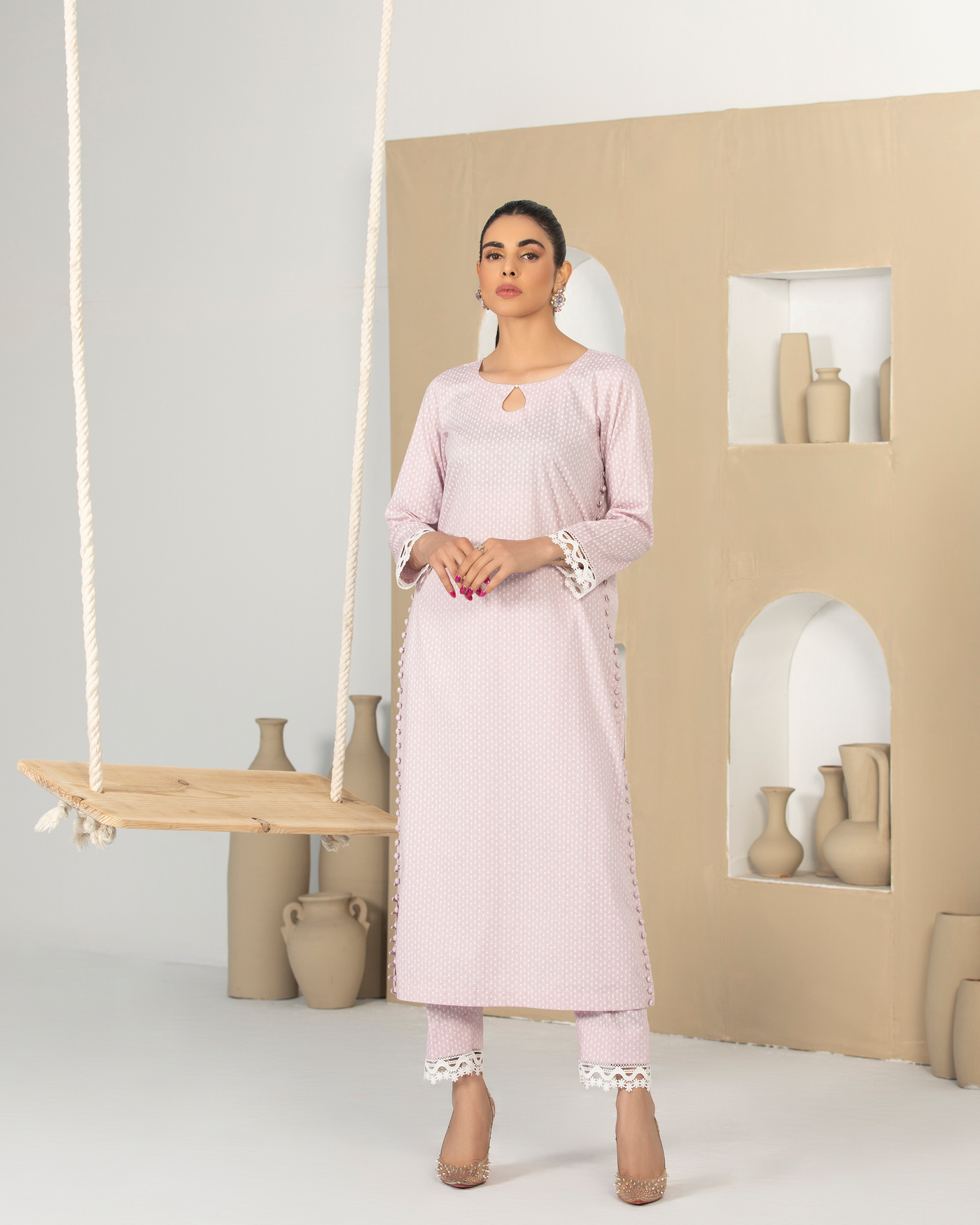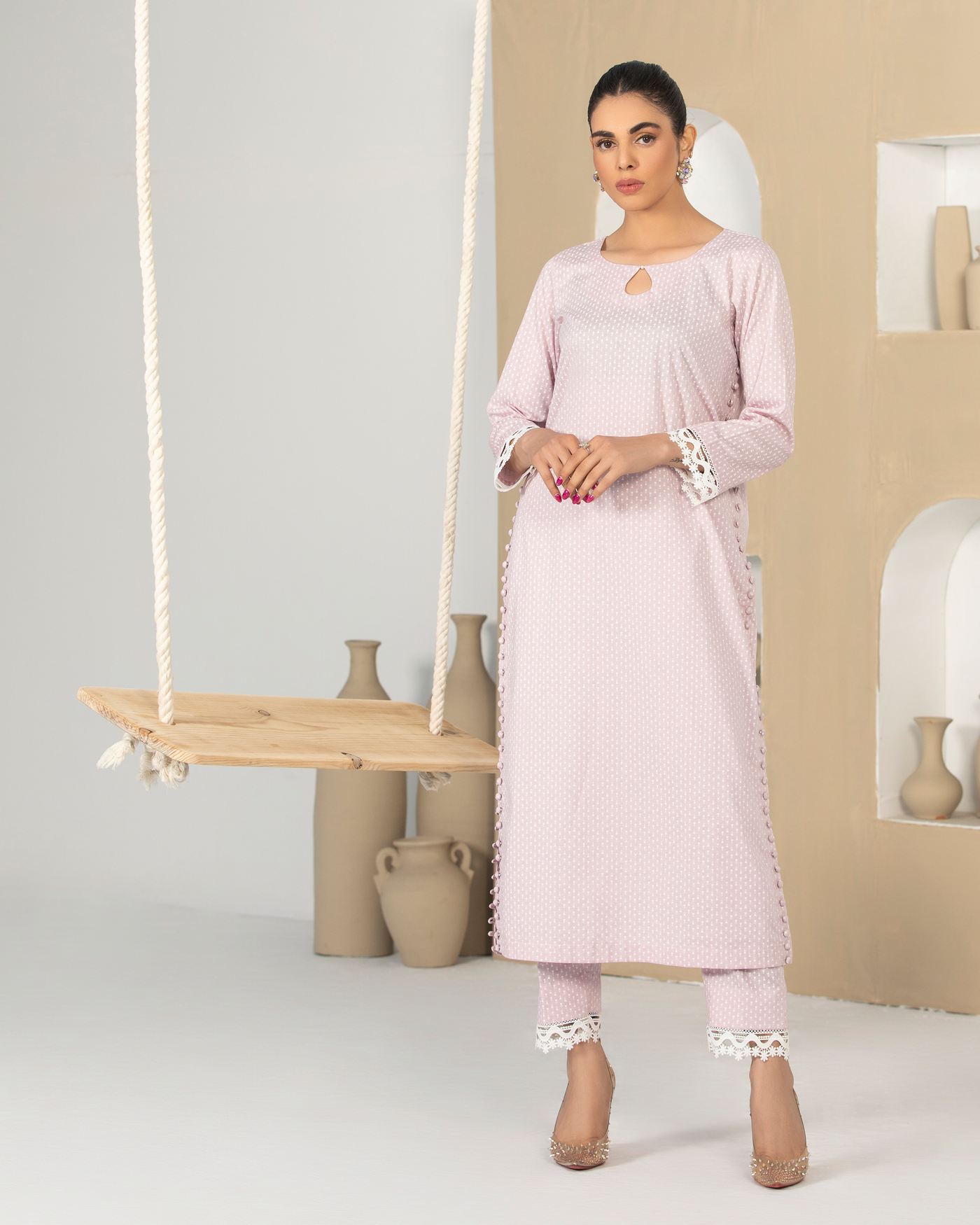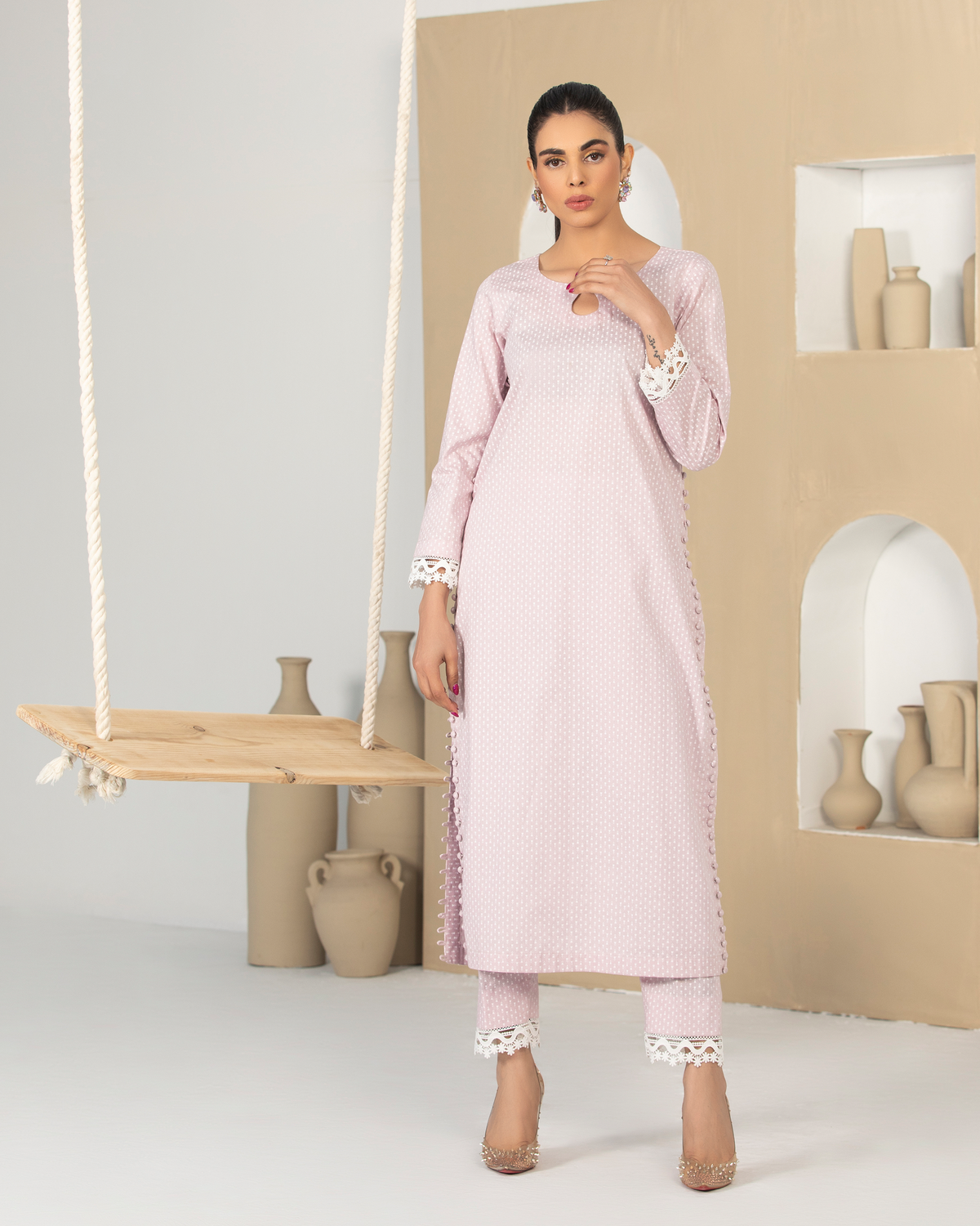 Yameen – A delicate fusion of elegance and charm. Crafted from premium cambric, this soft lavender ensemble features a subtle dotted pattern, lace-trimmed sleeves, and a unique keyhole neckline for a refined touch. The intricate button detailing along the sides adds a graceful flair, making it an ideal choice for effortless sophistication. Whether for casual elegance or understated festive wear, Yameen embodies timeless beauty with a modern twist.