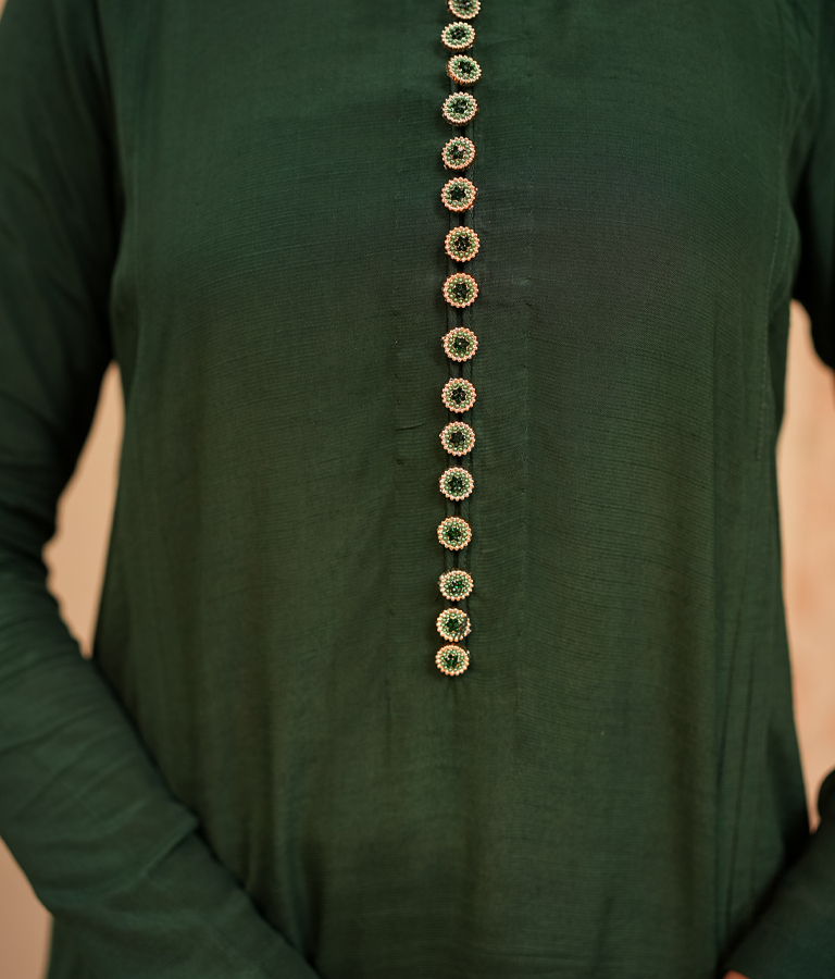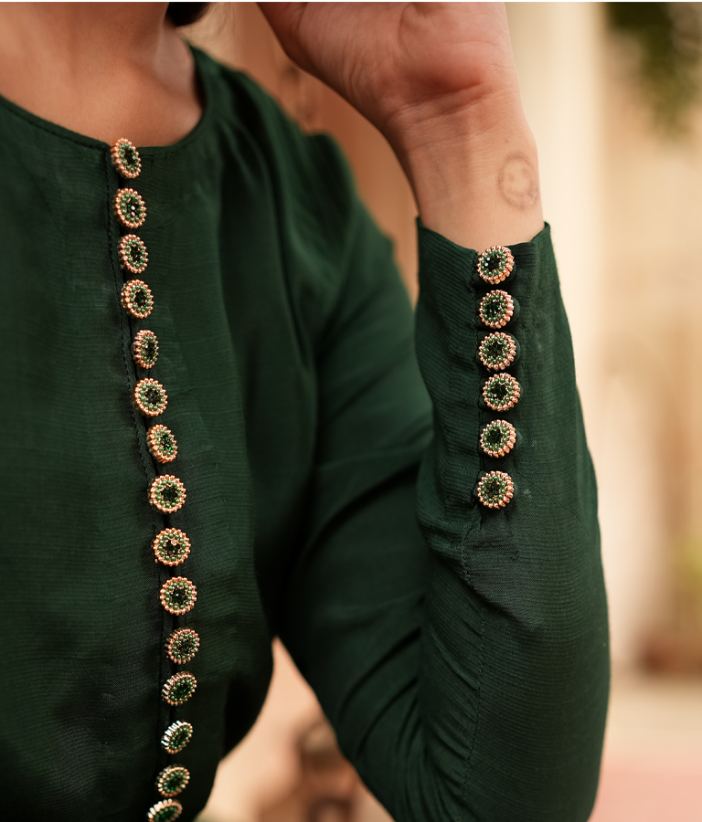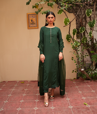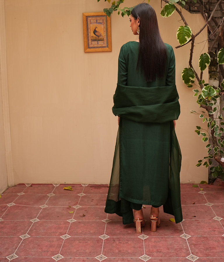Presenting Layla, an enchanting emerald green outfit crafted from pure raw silk to add a touch of luxury to your wardrobe. This elegantly designed kurta features a row of delicate button embellishments down the front, perfectly complemented by full sleeves for a refined look. Paired with matching trousers and a sheer organza dupatta, Layla embodies elegance and grace, making it a versatile choice for festive celebrations, formal events, and special occasions.