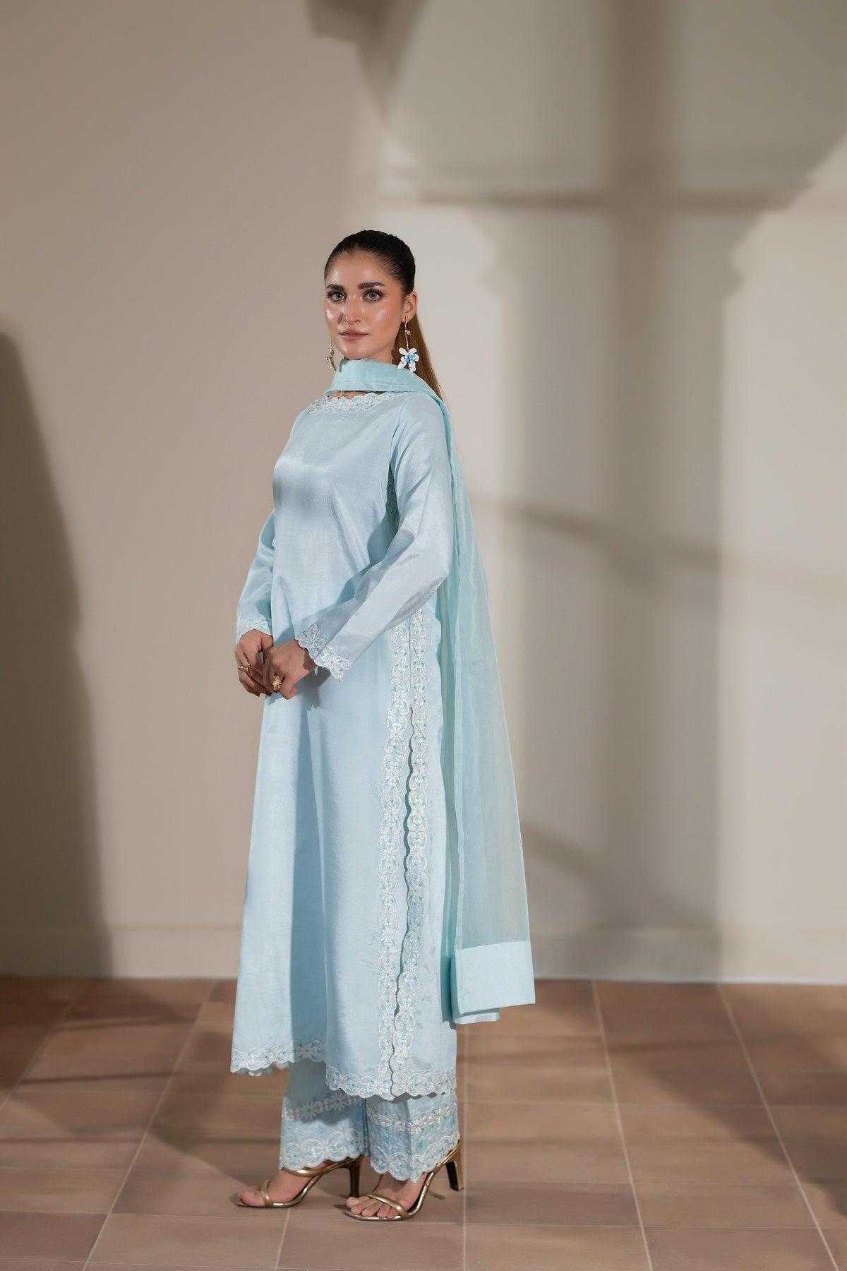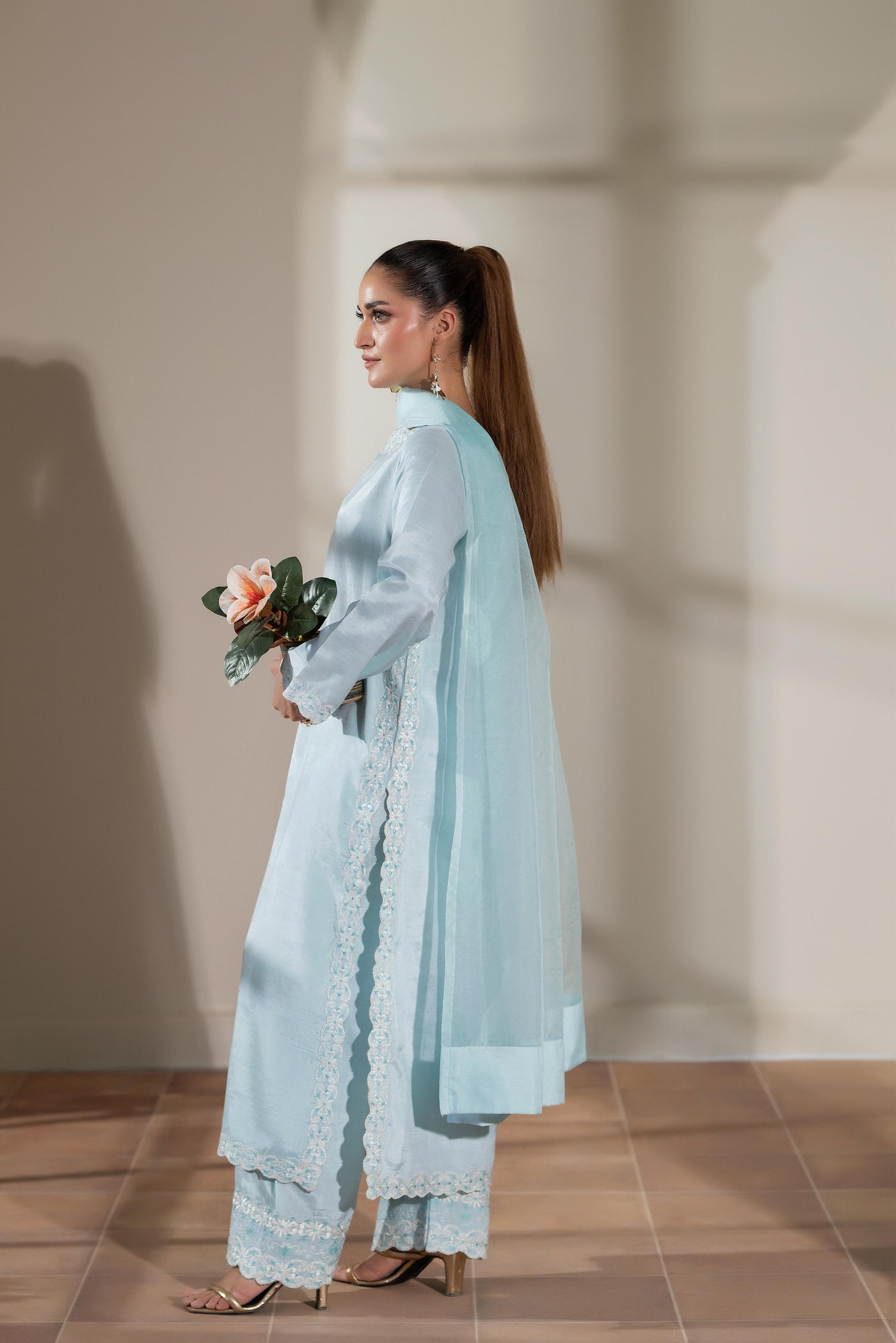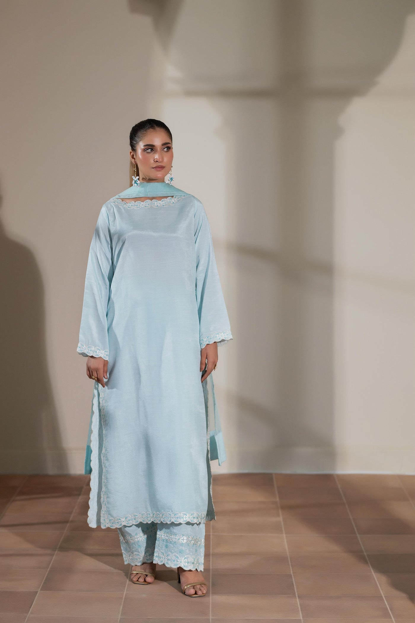 A serene three-piece ensemble in soft sky blue raw silk, crafted with refined embroidery that enhances its graceful silhouette. The shirt features delicate embroidered details along the neckline, sleeves, hemline, and side panels, paired with trousers finished with intricate embroidered borders. An airy organza dupatta completes the look, making this outfit the perfect balance of sophistication and elegance for festive and formal occasions.