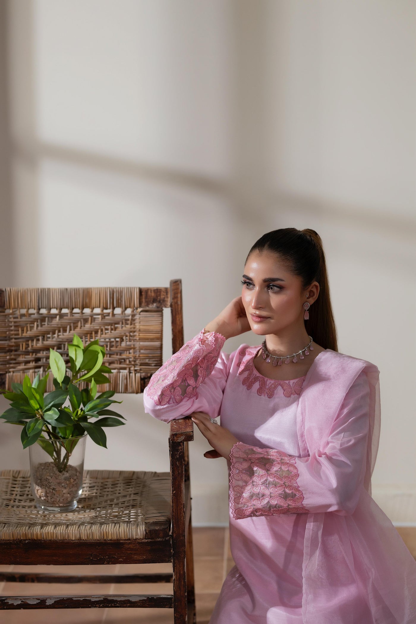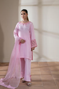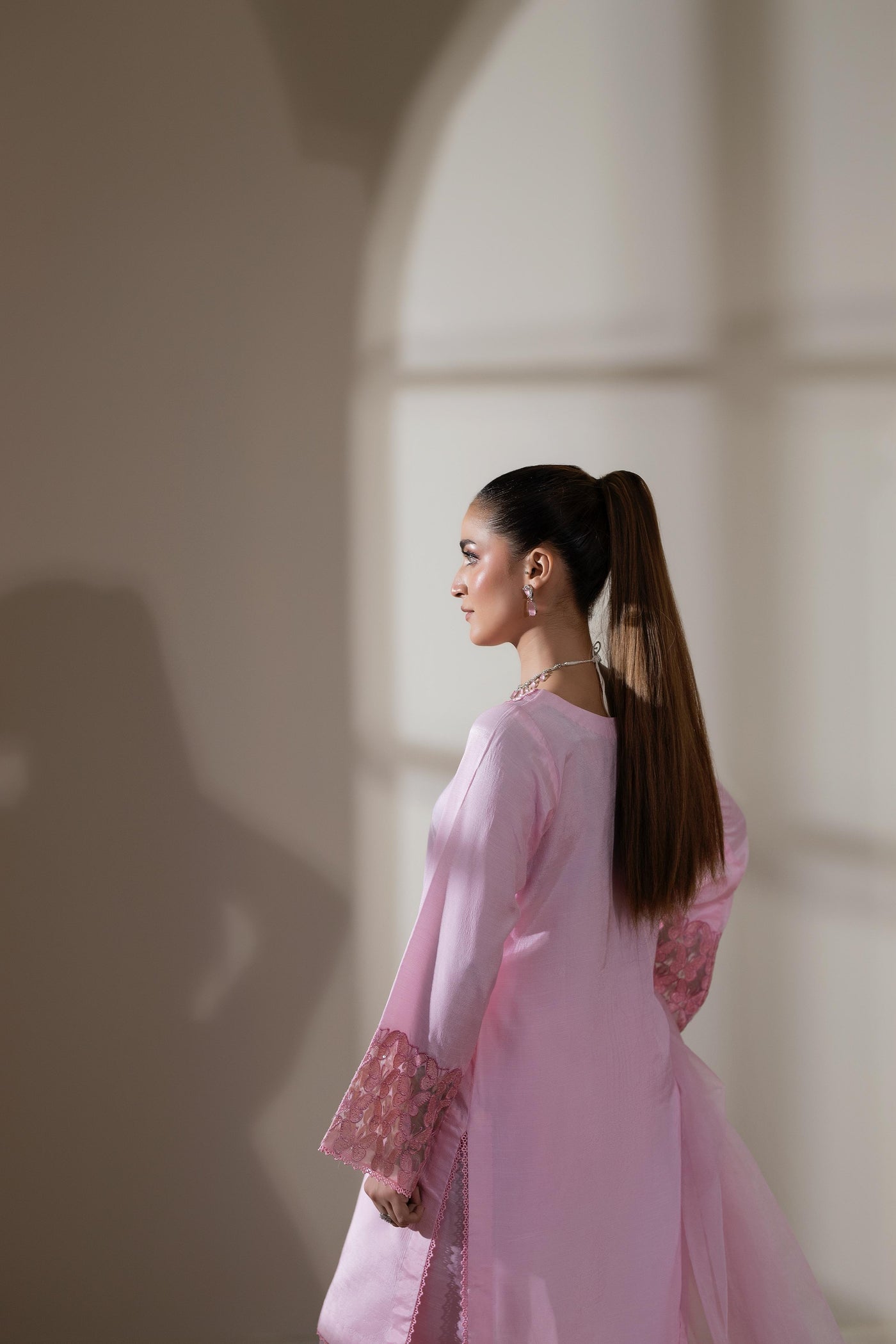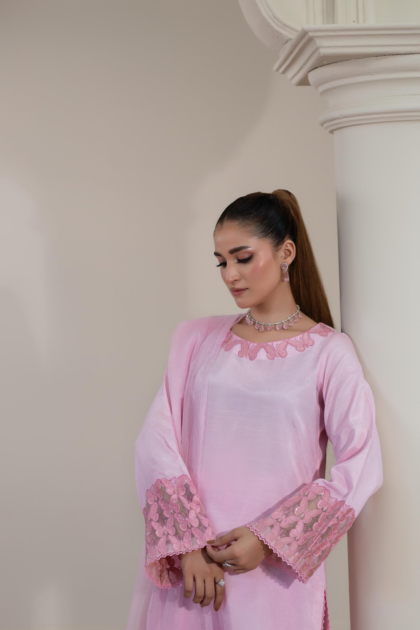 A timeless three-piece ensemble crafted from pure raw silk, designed for effortless sophistication. The soft blush pink shirt features delicate lace embroidery along the neckline and sleeves, paired with straight trousers adorned with subtle detailing. A lightweight organza dupatta completes the look, adding grace and fluidity. Perfect for semi-formal occasions, this minimal yet refined attire blends classic charm with modern elegance.